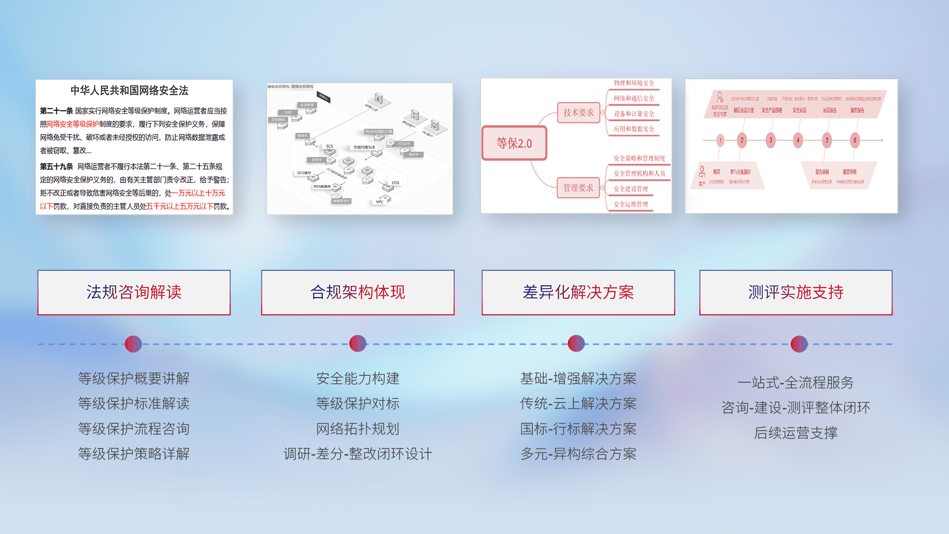 通过专业的法律咨询解读、、、、合规架构体现、、、差异化解决方案、、、测试实施支持等服务,,,,为客户量身打造等保合规体系。。。。